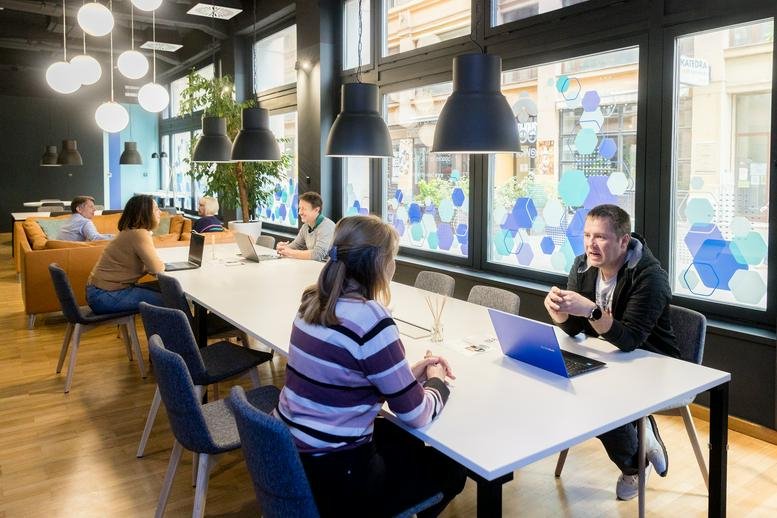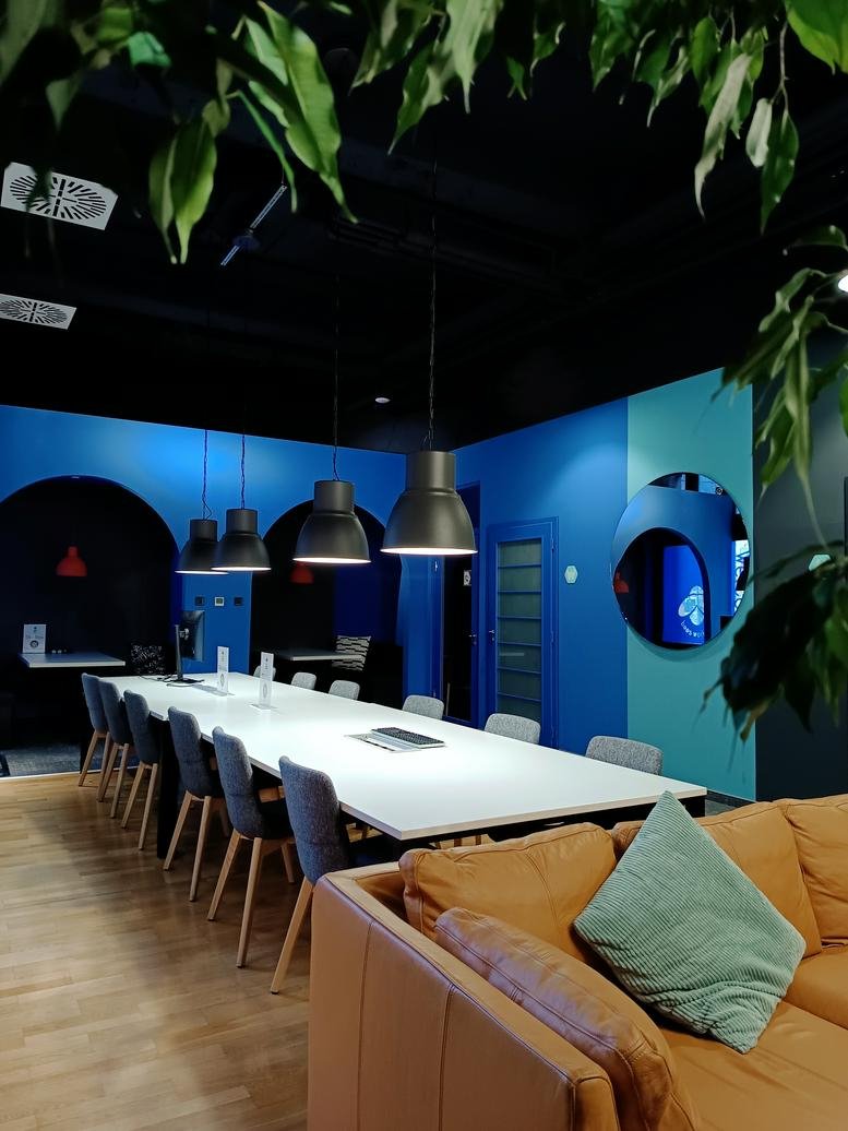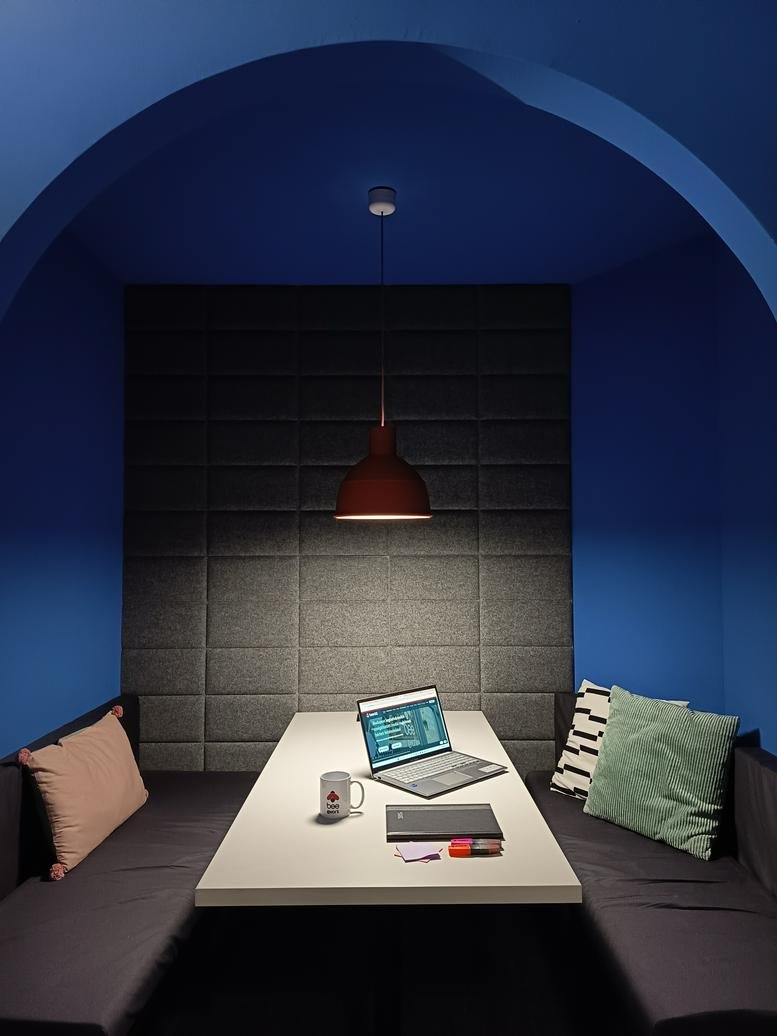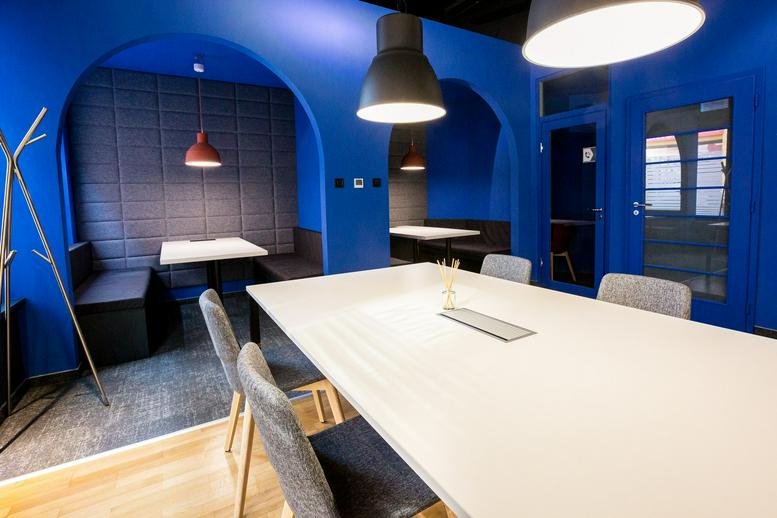 Bright workstations and acoustic booths define this refurbished workspace, designed for teams seeking a professional yet comfortable base. Private offices starting at 20 square metres sit alongside flexible coworking options, all supported by 24-hour access and high-speed internet.