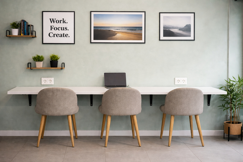 Filled with natural light and featuring a minimal design, this workspace is a calm retreat for professionals needing to focus. It provides individual workstations at shared desks, where each spot comes ready with comfortable seating, dedicated power outlets, and reliable high-speed WiFi.