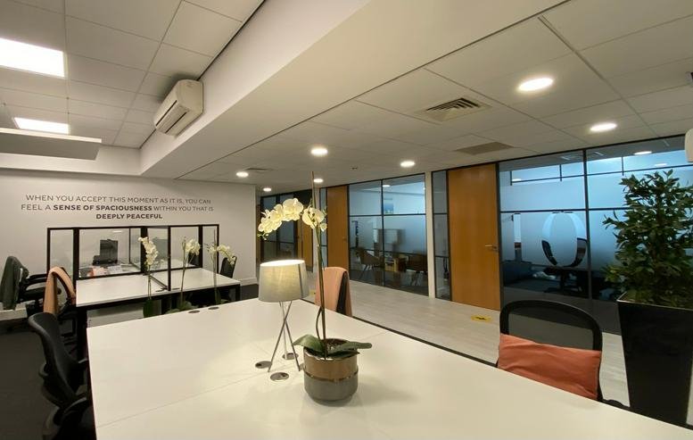 On the first level, you'll find fifteen modestly-sized offices, ten co-working desks, a spacious conference room, a reception area, a kitchen, showering amenities, a breakout zone, and a wellbeing-focused cafe.