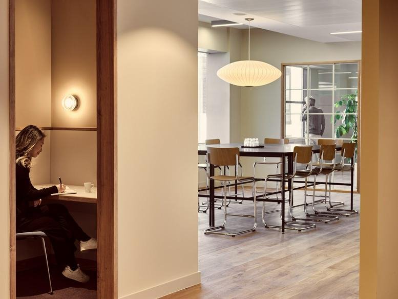 The comprehensive communal facilities, including a lounge, café, focus booths, library, and bar, generate a spacious and relaxed working environment.