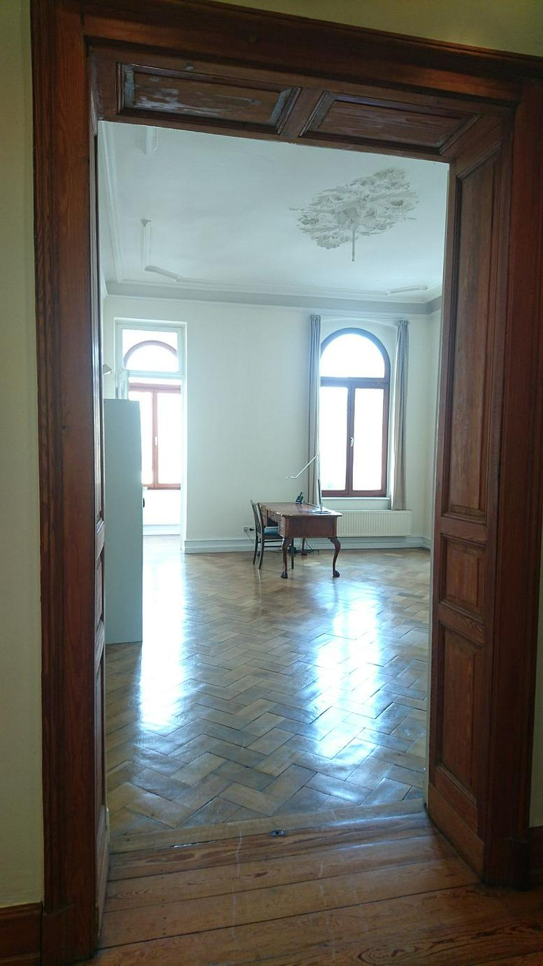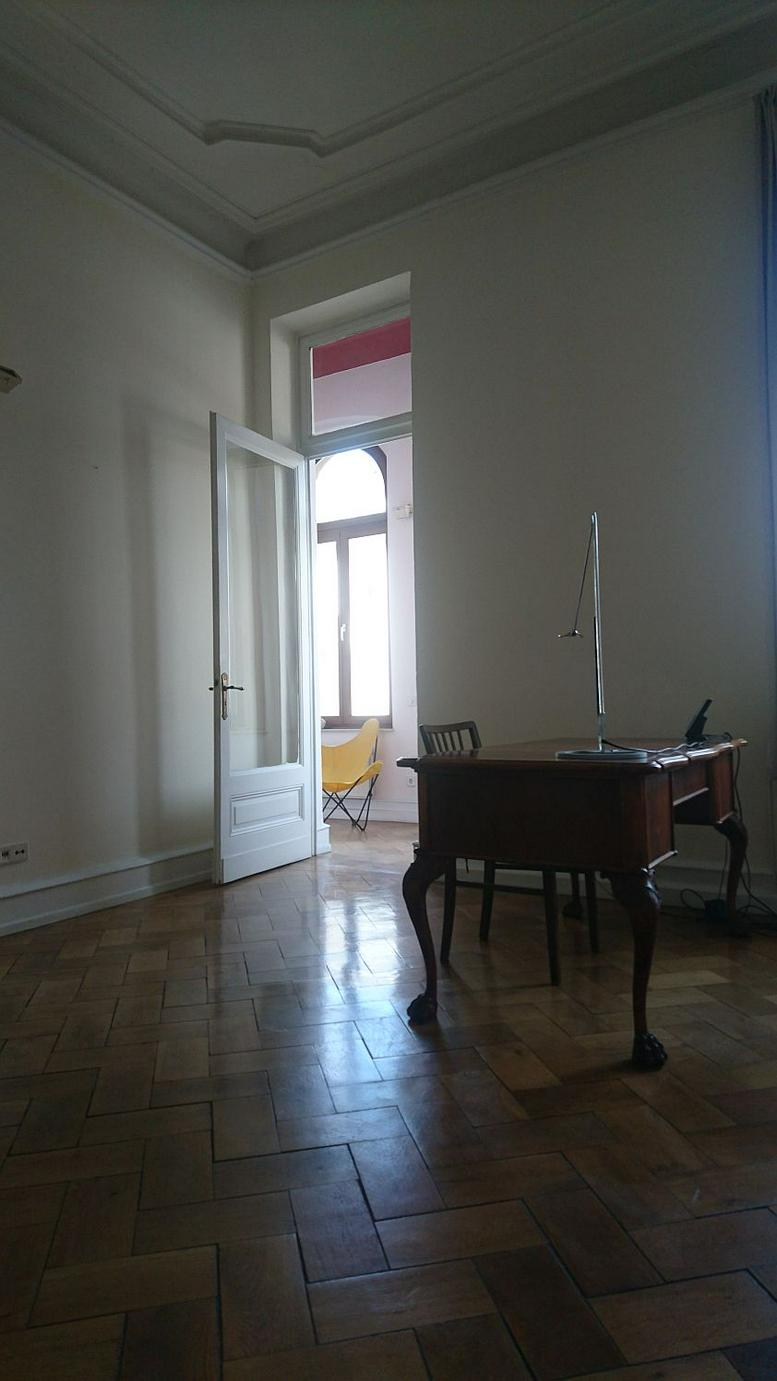 Located at the intersection of Rathenau Street, the Belgian Quarter and Rudolfplatz, the room features a 1.5-square-metre bay window alcove and high ceilings. It can be furnished with adaptable pieces, including a convertible sofa and desks. Tenants share use of a bathroom, kitchen and an additional WC. Overnight stays are permitted, and the room is designated for professional use only. The calm environment, free from the distractions of open-plan offices, facilitates focused work. The total leased area, including shared facilities, is 60.7 square metres.