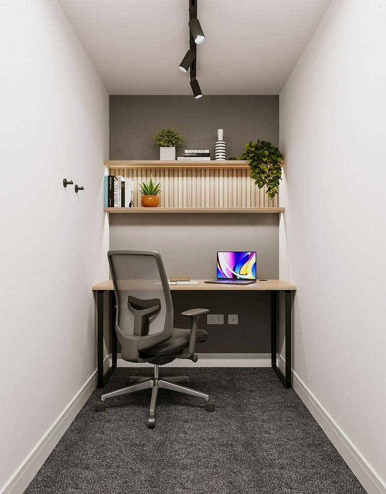 The private offices are intentionally designed to foster focus and productivity, ensuring an optimum work environment. The meeting room is not only a professional setting, but it also encourages collaborative dialogue and innovation. Ensuring a comfortable workspace is a priority, so the office spaces are warmed by adjustable temperature controls and softened by dropped ceilings.