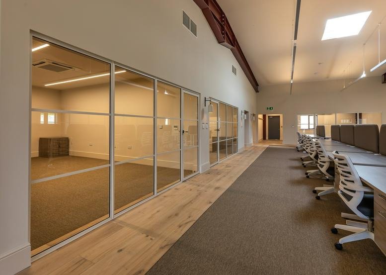 The offices come equipped with high-speed internet, climate control systems, and individual temperature and music settings. Tenants benefit from a private kitchenette, secured entry, and Zoom pods, along with full access to the clubhouse amenities. Notable features include two versatile meeting rooms and Doecroft, an impressive wood-panelled front office overlooking the farm's scenic landscape.
