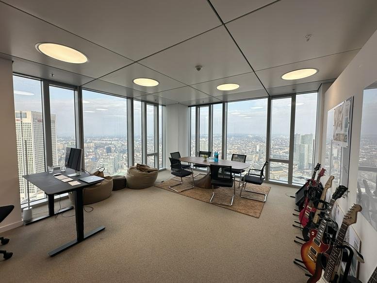Situated on the 37th floor of the Main Tower in Frankfurt's bustling banking district, this office space offers easy access to both the shopping district and Fressgass. A fitness suite and a gym are also available on the premises, providing perfect options for employees to focus on their mental well-being without the need to leave the premises.