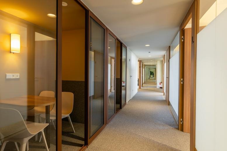 High above the city on the eighth floor, these workspaces offer impressive 360-degree panoramic views and abundant natural light. The professional environment is designed with acoustic comfort in mind, featuring private offices and meeting rooms kitted out with advanced audiovisual technology. For those hosting larger events, dedicated training rooms are available for workshops or seminars.
