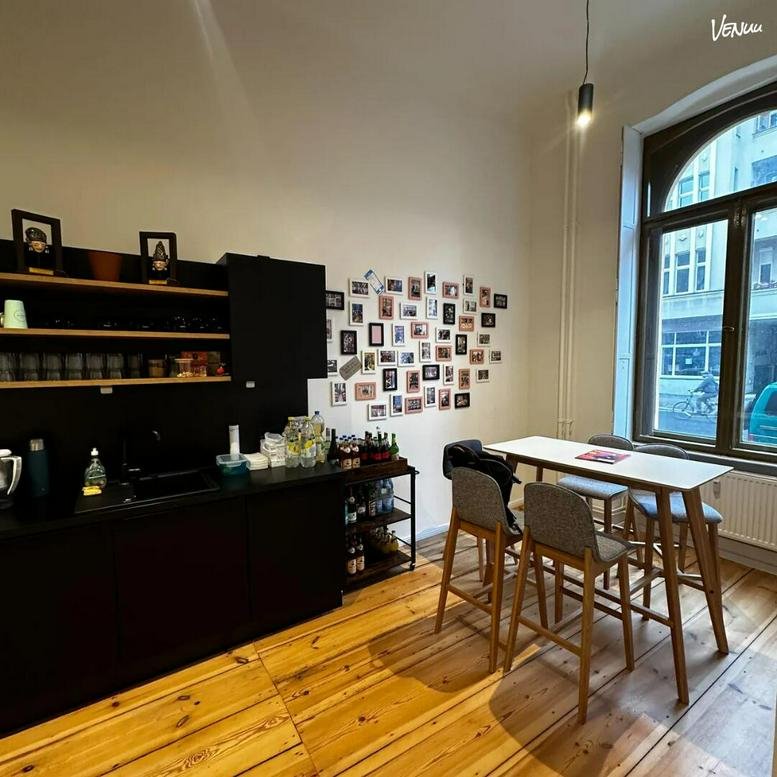 A separate presentation zone with a white wall is ideal for creative sessions, while the kitchenette comes fully equipped with a coffee machine, microwave, and fridge. The rental includes furniture and regular cleaning, with an internal courtyard available for breaks or parking. Flexible usage options are available, typically starting at two full days per week, with VAT calculated separately.